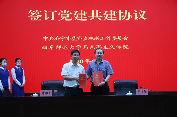 会上市直机关工委与曲阜师范大学马克思主义学院签订了党建共建协议,选聘了五位专家教授担任济宁机关党建指导员。曲阜师范大学马克思主义学院院长李安增就开展济宁市直机关党的建设合作发表了讲话,并提出马克思主义学院一定以签订本次协议为契机,助力济宁机关党建各项工作,切实发挥智力优势和人才优势,最终促进党建理论和实践成果实现共赢。