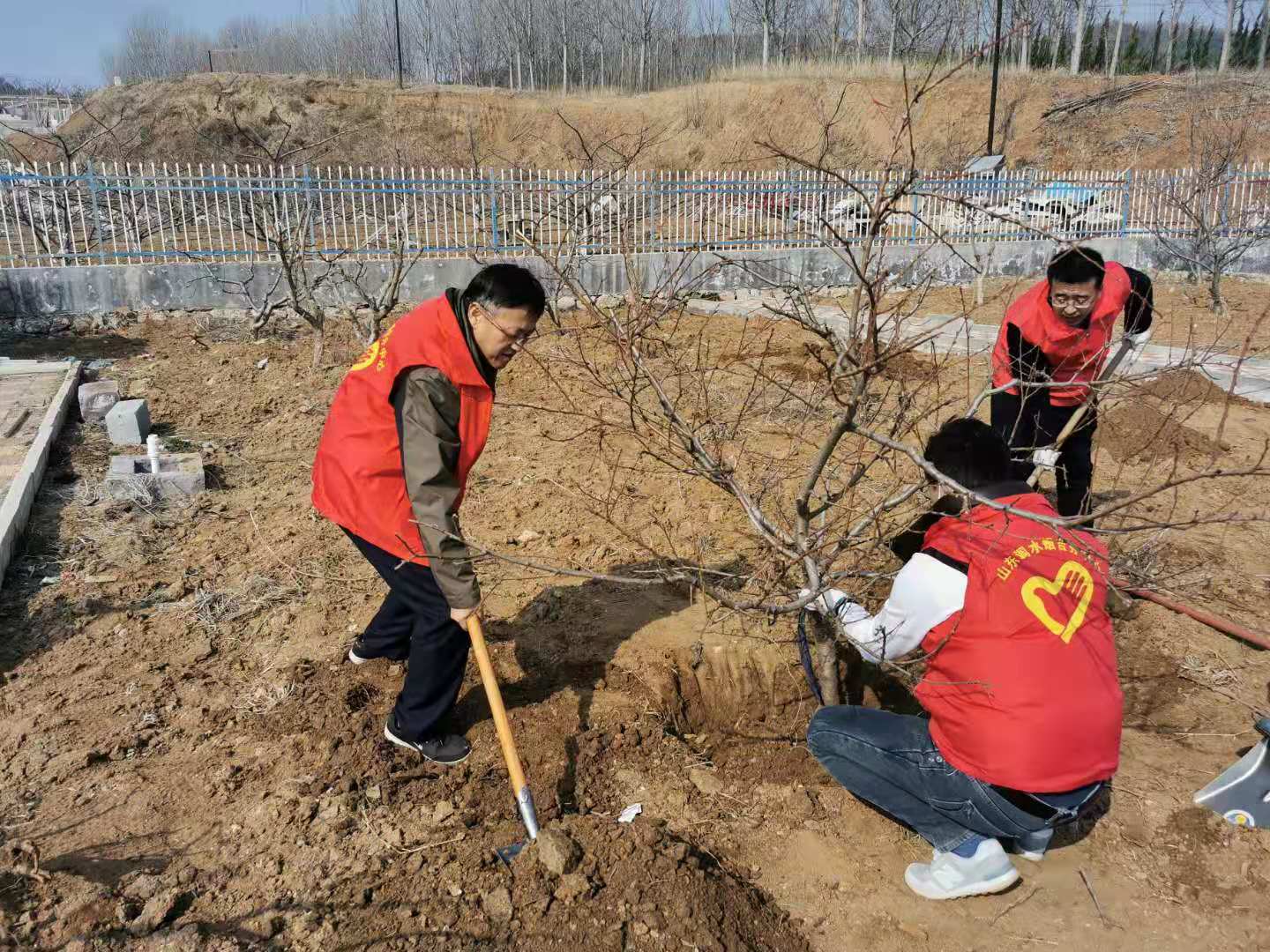 植树活动现场,一片热火朝天的忙碌景象。大家两三人一组互相配合,挥锹铲土、培实新土、堆起围堰、提桶浇水,每一道工序都做的认真细致、规范到位。经过一上午的忙碌,预定植树任务圆满完成,新栽下的桃树错落有致、迎风挺立,萌发着无限生机和希望。