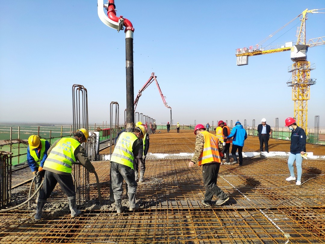 主厂房施工封顶是王道泵站工程建设的关键节点,为保证施工质量及安全,浇筑前,东营分中心组织召开专项施工部署和质量安全会议,就施工安全防护措施、质量保障措施以及砼浇筑工艺进行了认真研究和讨论,同时联合设计、监理、施工等单位对盘扣式重型承重脚手架、钢筋绑扎、模板拼接及加固、柱、梁、板的设计尺寸等关键工序进行了全方位验收,确保混凝土具备浇筑条件。合格的原材是生产合格产品的前提,浇筑过程中,各参建单位精心组织,分工明确,在混凝土的生产过程中各单位联合派驻专业人员进站监拌,严控混凝土水胶比、和易性及塌落度;在浇筑现场,重点管控混凝土布料厚度、振捣时间、整平收面,严格控制每道工序是生产合格产品的措施保障;各施工班组值班人员恪尽职守、各司其职,在浇筑过程中随时进行纠正和加固支架,确保浇筑过程万无一失。